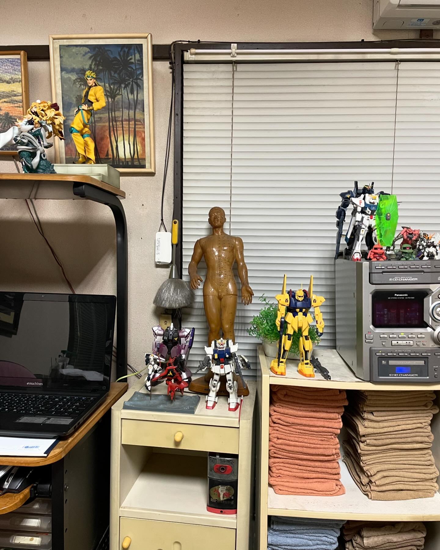 私の治療院にある経絡経穴人形、お灸の煤で黒光り、てか周りのガンダム、ジョジョコレクションで、経絡経経穴人形は完全に、陰が薄い存在になってます。38年前開業する時に師匠天心堂鈴木捷道先生に頂いた人形です。 先生の経絡治療を今だに引き継ぎ、その証の経絡経穴人形で宝物です。 私が治療している限り、洗わずにずにお灸のヤニが、私の 治療院の存続の歴史に残る為の証しとなるでしょう😅 葛飾区四つ木の鍼灸整体治療院 宝寿堂鍼灸治療院 院長 鈴木 秀寿