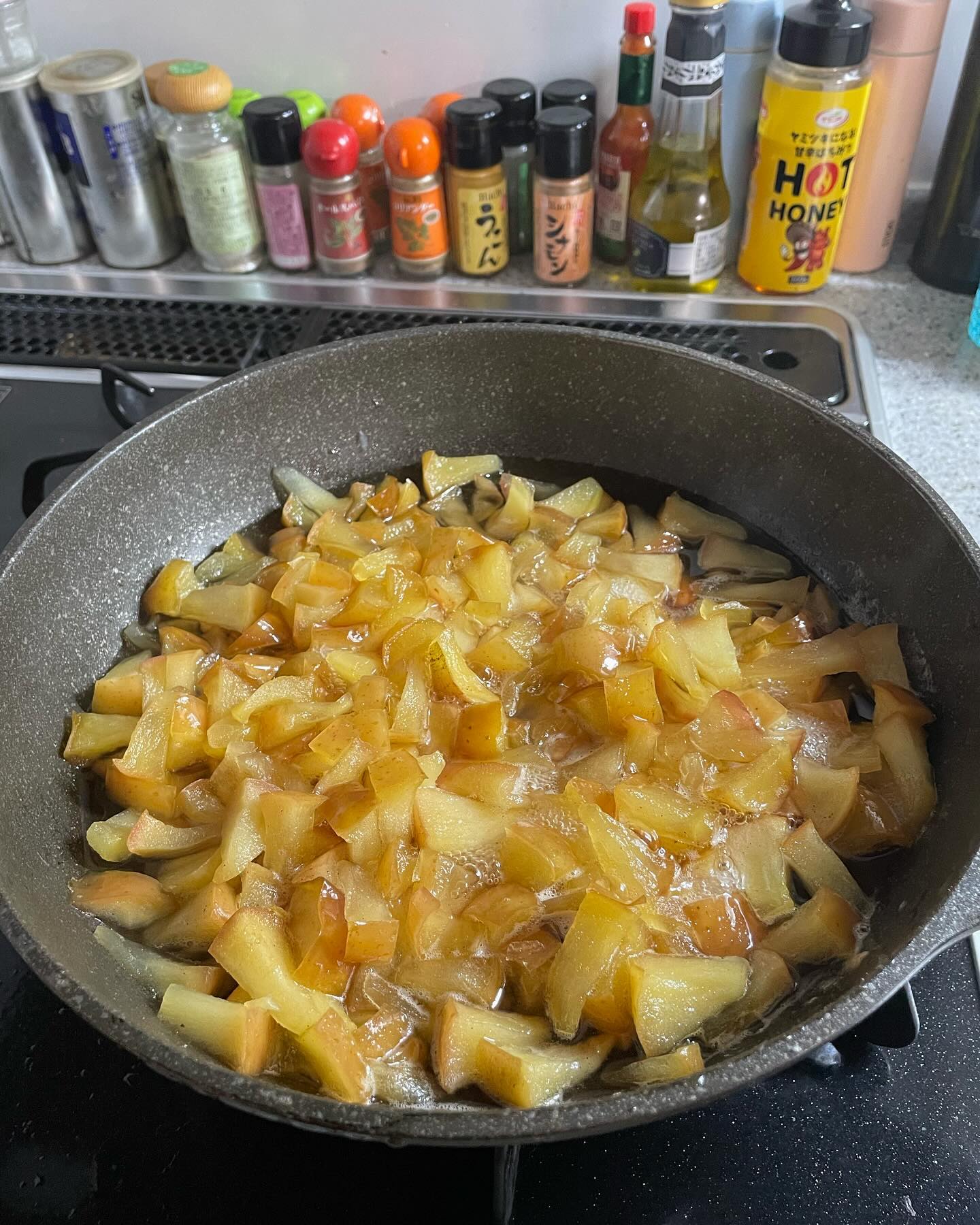 リンゴジャム🍎作り 手製のリンゴジャムが無くなったので。リンゴをお酒で煮込みアルコールを飛ばしたところに、お砂糖とオリゴ糖を入れ、水分が無くなって飴上になったらシナモンを入れて完成致します✌️ 宝寿堂鍼灸治療院 院長 鈴木 秀寿 #葛飾区四つ木の鍼灸整体 #京成線四つ木 #鍼灸経絡治療 #鍼灸癌治療